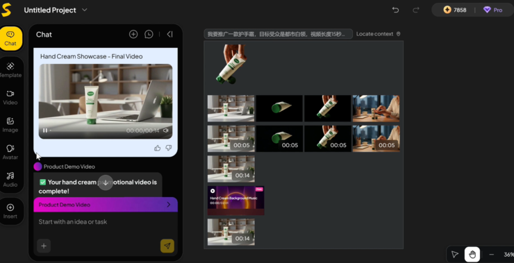 除此之外,我们还用 Agent 做了一个 15 秒的护手霜广告视频实验。只上传了一张产品图,并输入提示词:“我要推广一款护手霜,目标受众是都市白领,风格轻快。”