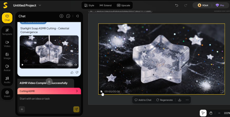 我们还用画布生成了一段 ASMR 视频,主题是“星辰摩擦的声音”。模型在生成时准确捕捉了声波的颗粒感与空间分布,声音层次分明,节奏自然,带有切割肥皂般的细碎触感。视觉与音频在同一画布内被同步渲染,整体效果极其干净、细腻。