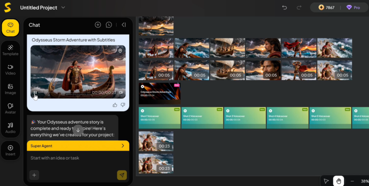 我们先是用 Agent 创作了一个关于奥德修斯冒险的旁白故事视频。从人物造型、脚本撰写,到静态画面的生成、动态镜头的延展,再到解说人声和字幕的添加,整个流程几乎无需额外干预。