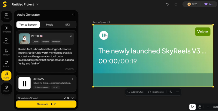 同时,画布还支持将文字直接生成语音。只需在界面中输入台词或旁白,系统便能自动生成语气自然、情感流畅的声音,为画面增添完整的叙事节奏。无论是品牌讲解还是人物旁白,语音都能与画面氛围保持统一,让静态的创意真正“说话”。