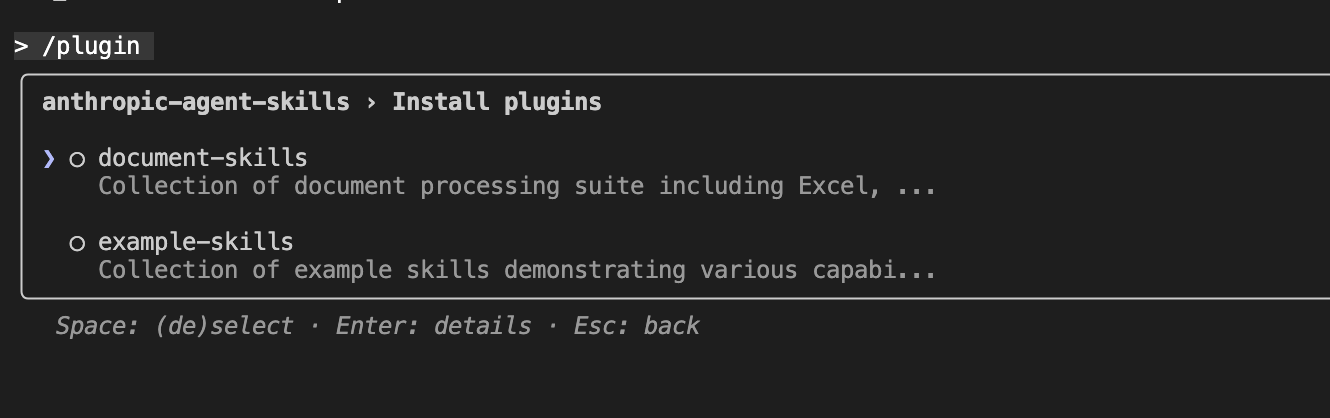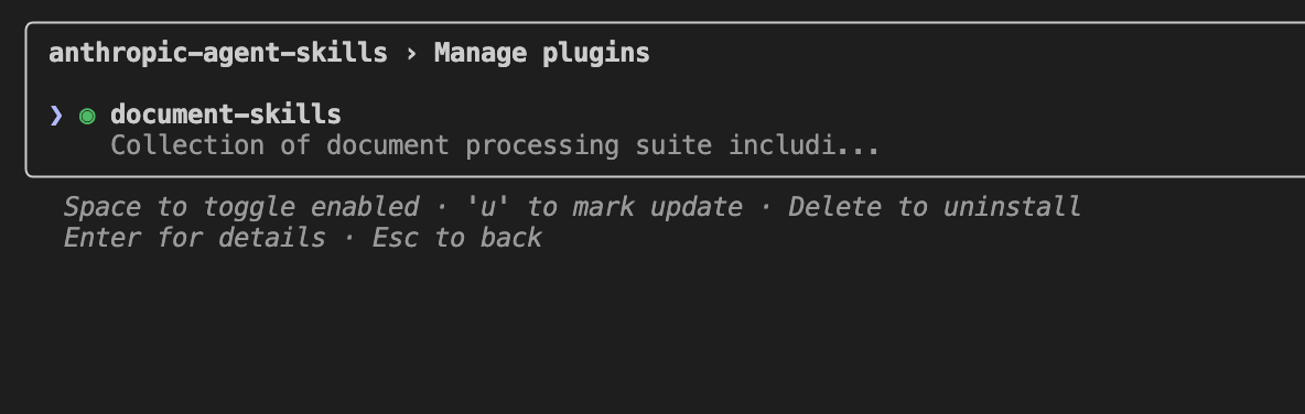 重启Claude Code后,再次输入/plugin命令→选择"Manage and uninstall plugins"→进入"anthropic-agent-skills",即可看到document-skills已成功安装。