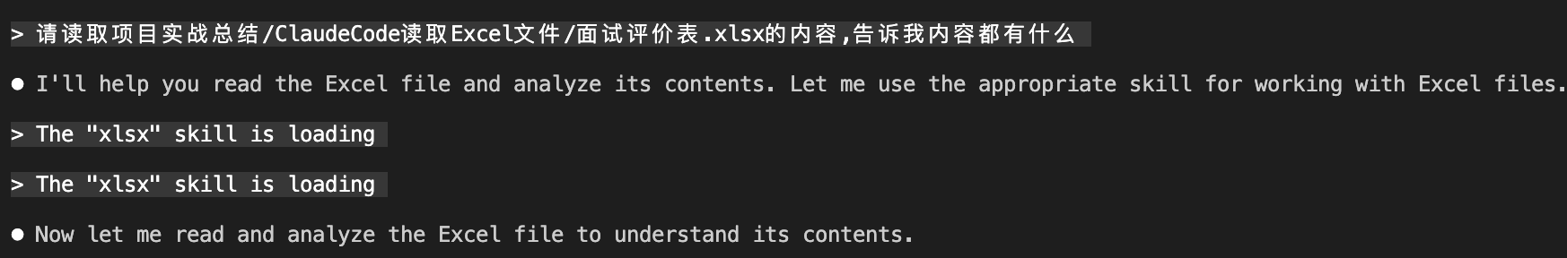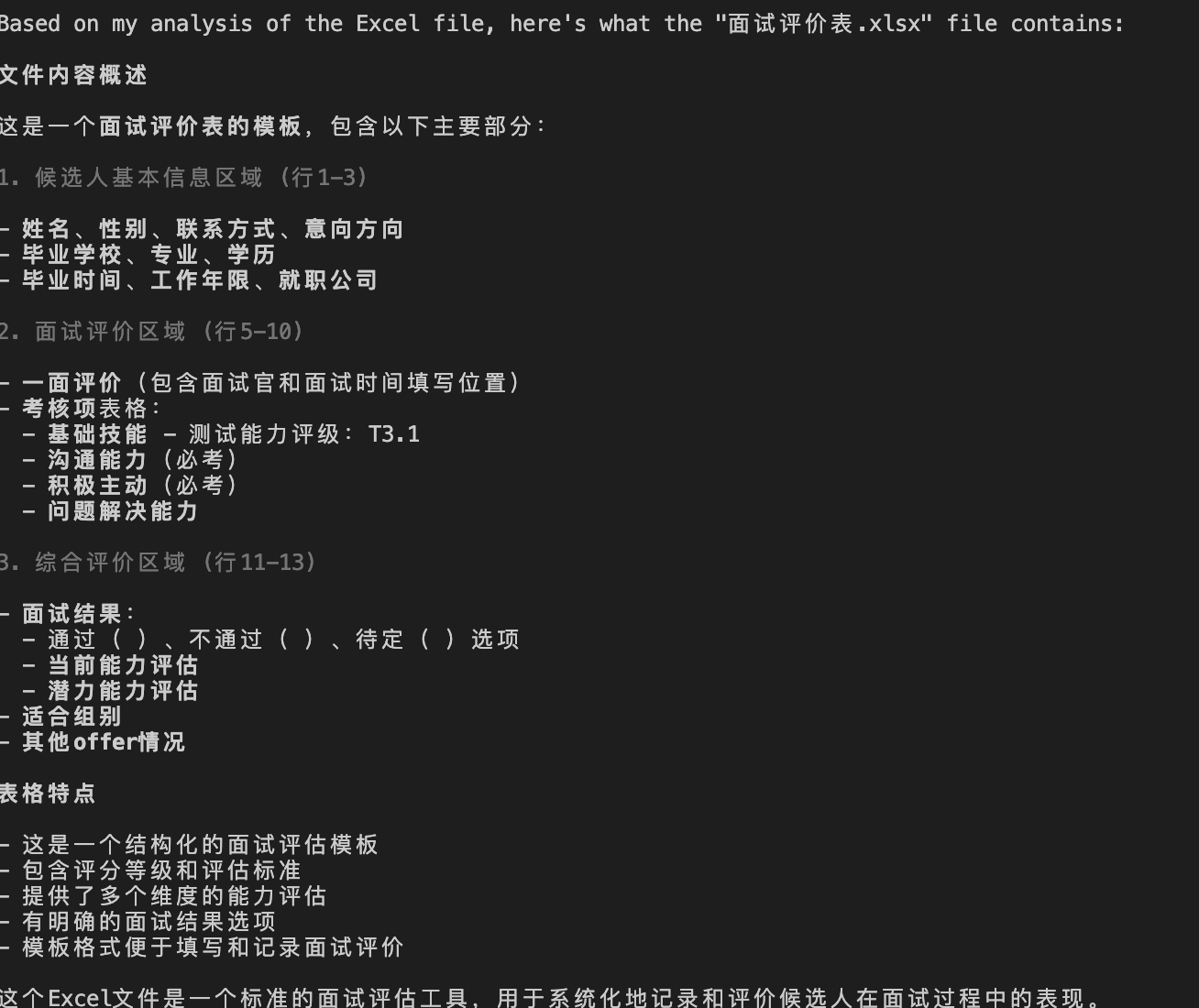 首先测试Excel读取能力。启动Claude Code之后,只需要在输入框使用提示词即可触发对应的技能,例如:请读取 面试评价表.xlsx文件并告诉我对应的内容