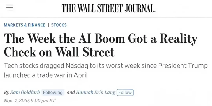 AI 的估值泡沫,在美股 AI 神话的破灭中最先得到验证。2025 年 11 月, AI 资本市场创今年 4 月份以来最差表现,纳斯达克指数单周跌幅超 3%。