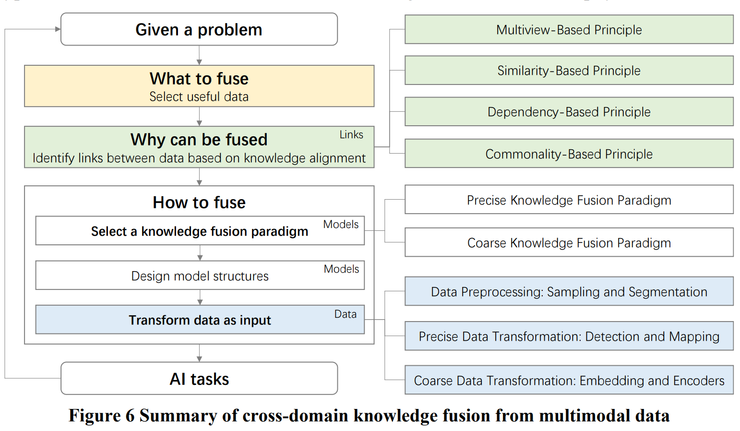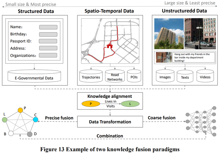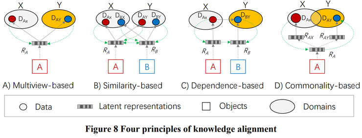随后,在知识对齐阶段,需要确定这些异构数据为何能够被融合。研究通过多视角、相似性、依赖性与共性四类原则来建立不同数据之间的联系。