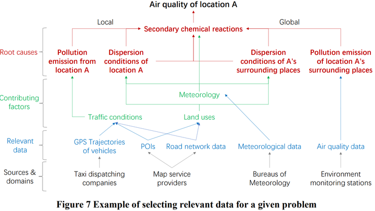 首先,在数据选择阶段,需要明确任务相关的数据来源并分析问题的根因。例如在空气质量推断中,污染受本地排放、区域传输、气象扩散和化学反应等因素共同影响,因此必须从不同领域筛选与这些因素对应的数据,包括反映土地利用的道路网络和 POI、反映人类活动的出租车轨迹、反映扩散条件的气象数据以及提供真实污染读数的监测站数据。由于这些数据来自交通、城市规划、气象与环境监测等多个领域,它们构成了典型的跨域数据组合。