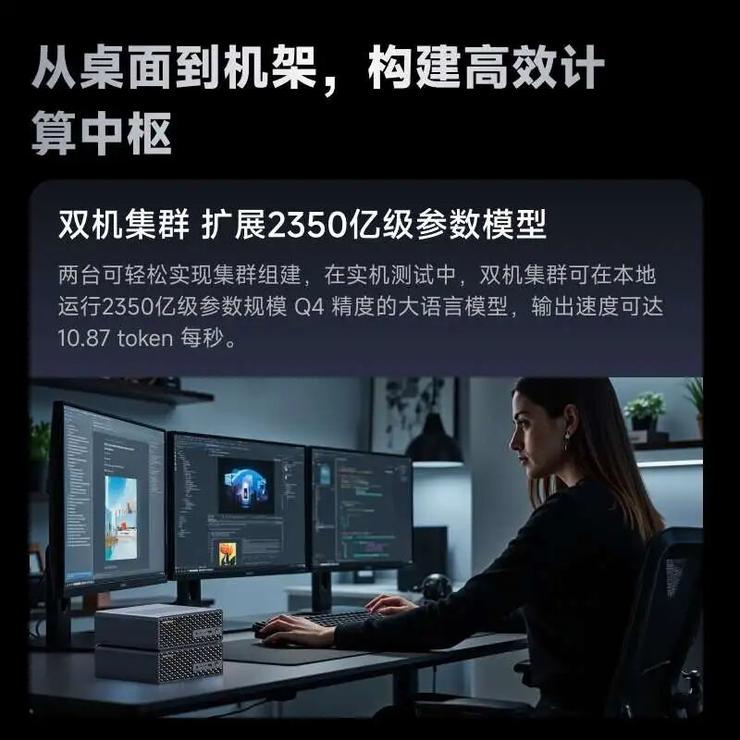 该设备支持最高 128GB LPDDR5x-8000MT/s 四通道统一内存,配备 USB4V2、双 10GbE 网口和PCIE扩展卡。支持Wi-Fi 7 和蓝牙 5.4,可从桌面部署扩展至机柜集群(通过高速USB4V2高速接口)。单机可在本地运行 Llama 109B、DeepSeek-R1 70B 等大模型,并可四机集联处理满血版 Deepseek 6710 亿参数 Q4 模型。
