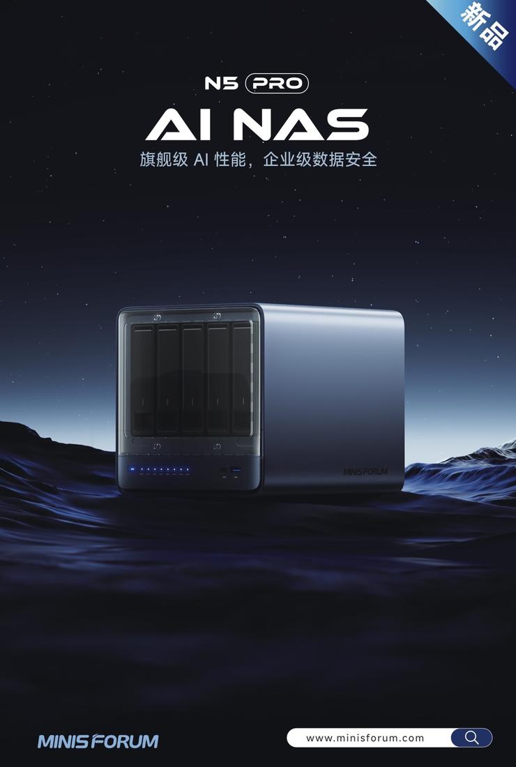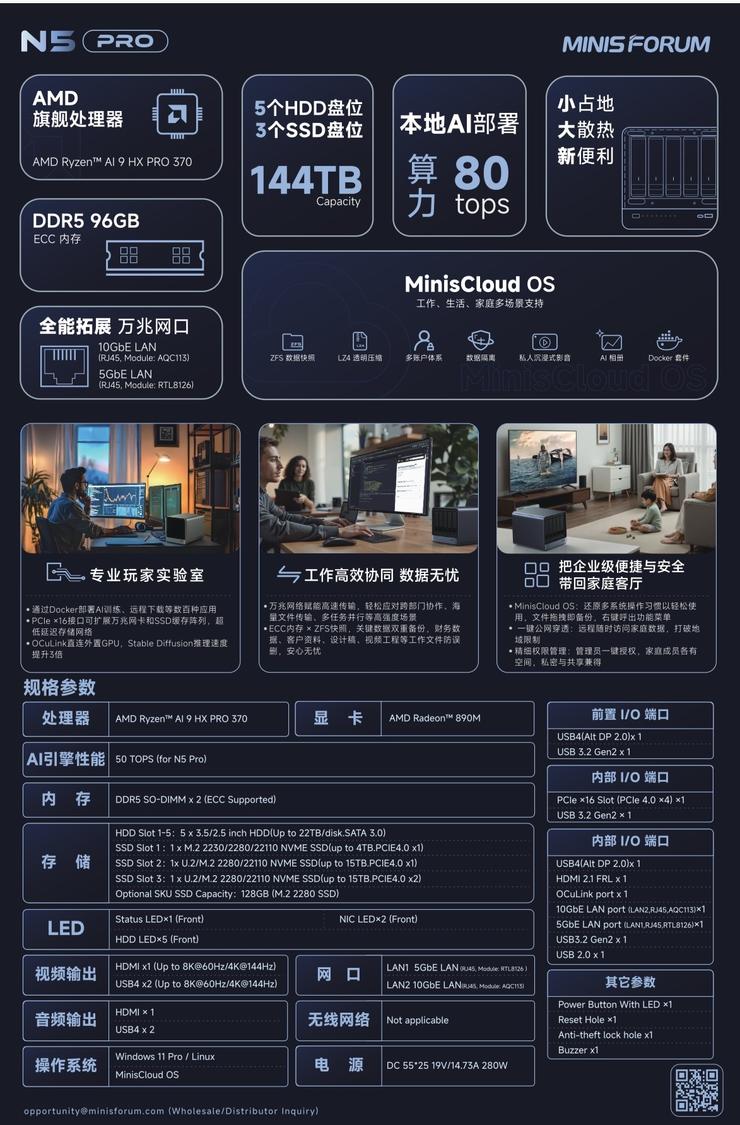 MINISFORUM铭凡 N5 Pro 搭载 AMD 锐龙 AI 9 HX PRO 370 处理器(12 核、最高 5.1GHz)及最高 80 TOPS 算力,为家庭与小型团队重新定义安全与智能的存储体验。