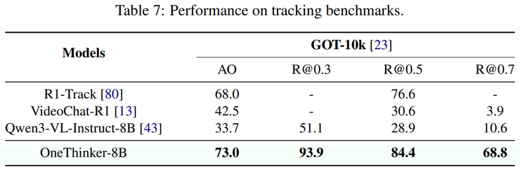 在目标跟踪任务中,OneThinker 需要在视频序列中持续、稳定地定位同一目标。实验结果显示,该模型在跟踪精度和整体稳定性方面均明显优于对比方法,尤其在长时间序列中表现更加稳健。
