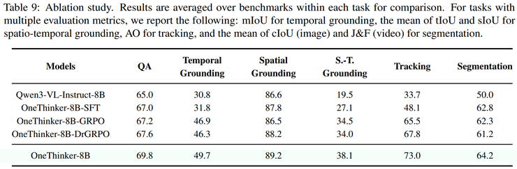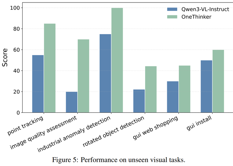 最后,在未参与训练的新任务上,OneThinker 依然表现出较好的零样本泛化能力,说明统一多任务训练有助于模型学习更加通用和可迁移的视觉推理知识。