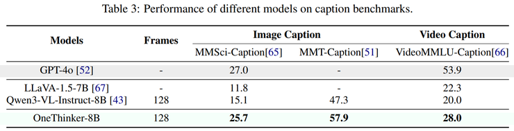 在图像和视频描述任务中,OneThinker 需要生成与视觉内容高度一致、语义连贯且信息完整的自然语言描述。实验结果表明,该模型在图像描述和视频描述任务中均取得了较为领先的性能,生成文本在准确性、完整性和语言质量等方面均有明显提升。