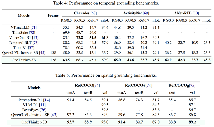 在时间定位任务中,模型需要准确判断事件在视频中发生的起止时间;而在空间定位任务中,则需要精确预测目标在图像中的空间位置。实验结果显示,OneThinker 在这两类任务中均取得了显著性能提升,能够更准确地理解事件发生的时间范围以及目标的空间分布特征。