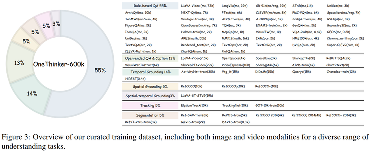 为支持统一多模态推理模型的训练,研究中构建了一个大规模、多任务的数据集,覆盖图像和视频两种模态。这个数据集包含问答、描述、时间定位、空间定位、时空定位、目标跟踪以及分割等多种视觉理解任务,数据来源广泛,涵盖多个应用领域和不同难度层级,从而为模型学习多样化的视觉推理能力提供了充分支撑。