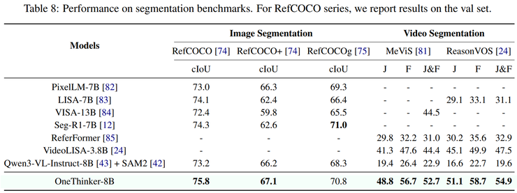 在图像与视频分割任务中,OneThinker 能够结合推理过程生成结构化提示,从而有效引导分割模型获得更加精确的目标区域。实验结果表明,该模型在细粒度视觉理解任务中同样具备较强竞争力,说明推理机制能够对感知类任务形成有效补充。