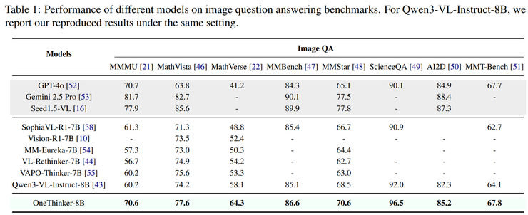 在图像问答任务中,OneThinker 需要同时处理视觉内容理解、数学推理、逻辑推断以及跨模态信息融合等多种复杂能力。实验结果显示,该模型在多项高难度图像问答任务中均取得了明显优于对比模型的表现,尤其在涉及数学推理、科学推理和多步骤逻辑推断的问题上优势更加突出。