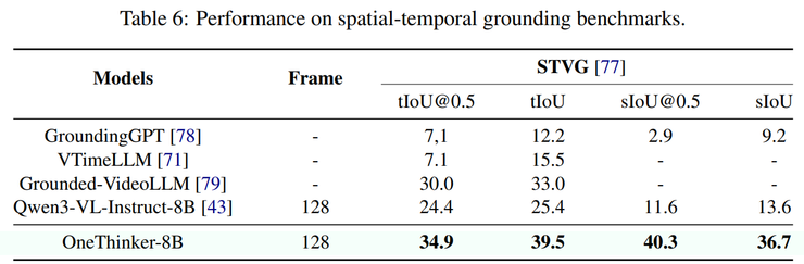 进一步地,在同时涉及时间与空间信息的联合定位任务中,OneThinker 同样表现出较强的综合建模能力,表明该模型能够在统一框架下同时处理“何时发生”和“发生在哪里”这两个关键问题。
