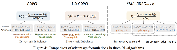 针对多任务训练中不同任务奖励分布差异较大的问题,研究中提出了一种基于指数滑动平均的归一化方法,使各类任务在训练过程中能够获得相对平衡的优化信号,从而有效避免模型过度偏向少数奖励分布较强的任务。
