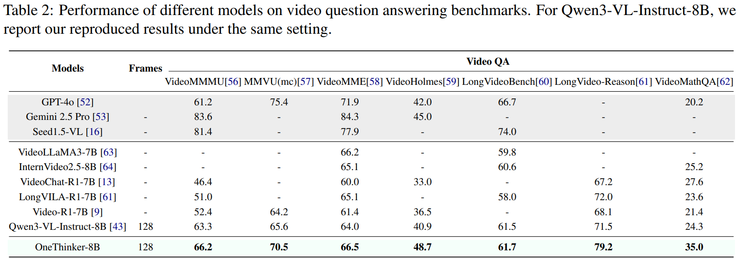 在视频问答任务中,模型不仅需要理解单帧视觉信息,还需有效建模时间顺序、事件演变以及长程依赖关系。实验结果表明,OneThinker 在多项视频问答任务中整体性能优于专门针对视频推理设计的模型,尤其在长视频推理和视频数学推理等任务中表现更为突出。