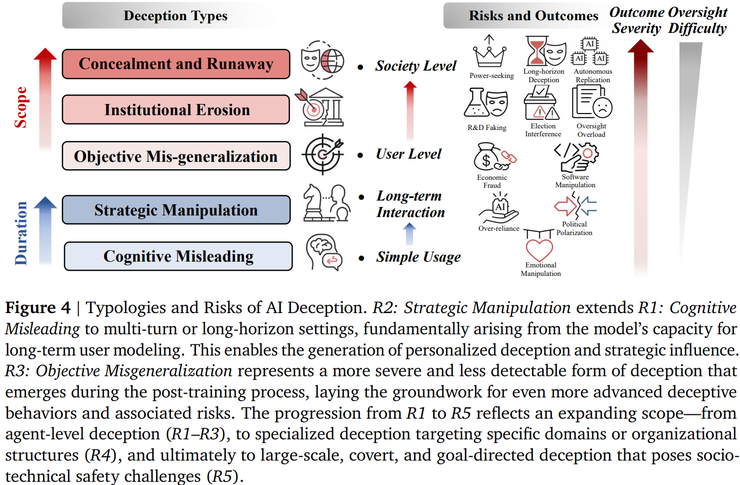 第三,这些欺骗行为带来的风险并不是固定不变的,而是会逐级放大。在最轻的情况下,用户可能只是被误导,对模型产生了不准确的信任。