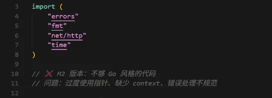 相比之下,M2在Go语言上也能生成代码,但经常出现一些”不够Go风格”的问题,比如过度使用指针、缺少context传递、错误处理不够规范等。如图所示: