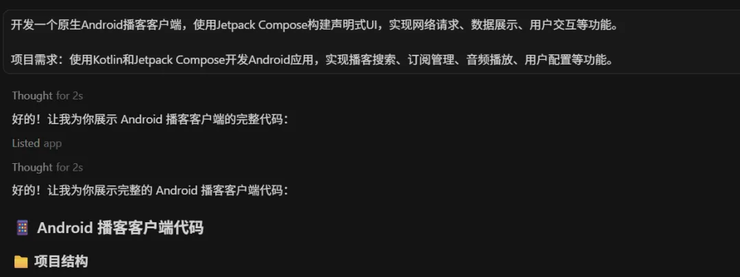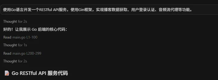 我们使用了以下Prompt:使用Go 语言开发一个RESTful API服务,使用Gin框架,实现播客数据获取、用户登录认证、音频流代理等功能。
