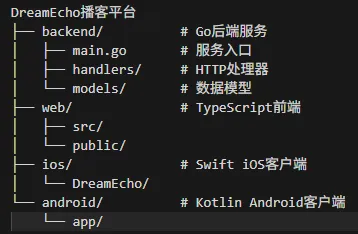 场景描述:在完整的播客平台项目中,同时使用Go、TypeScript、Swift、Kotlin四种语言,通过标准化的API进行跨平台数据交换。