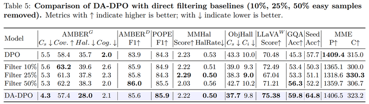 最终的实验结果表明,研究团队提出的 DA-DPO 方法在降低多模态大语言模型幻觉现象方面实现了稳定而显著的改进,同时在保持甚至提升模型综合能力方面也展现出明显优势。