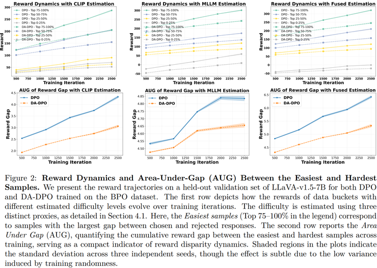 整体来看,这项研究具有重要的学术意义和实际应用价值。首先,从理论层面看,研究团队通过对训练动态、奖励变化轨迹以及样本难度分布的系统分析,揭示了一个此前在多模态偏好优化领域未被充分重视的问题:传统 DPO 虽然在形式上实现了偏好对的优化,但在训练过程中存在明显的难度偏置,模型更倾向于学习简单、差异明显的样本,而对语义复杂、区分细微、贴近真实应用情境的困难样本学习不足。