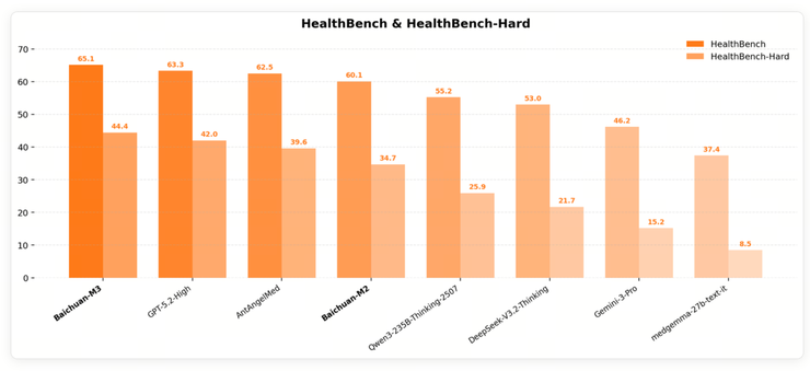 在 HealthBench 及其高难度子集 HealthBench-Hard 的测试中,Baichuan-M3 表现出了明显的代际提升。和上一代模型 Baichuan-M2 相比,M3 在 HealthBench-Hard 上的得分提高了 27.9 个百分点,最终达到 44.4 分,并超过 GPT-5.2,刷新了这一基准的最好成绩。同时,在 HealthBench 的综合排行榜中,Baichuan-M3 也排在第一位。这说明,在更复杂、更接近真实使用环境的医疗场景中,模型的稳定性和一致性已经明显提高。