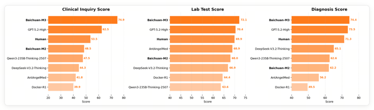 尤其是在最难、也最能拉开差距的临床问诊阶段,Baichuan-M3 得到了 74.9 分,不仅比第二名模型 GPT-5.2-High 高出 12.4 分,也明显高于 53.5 分的人类基线水平。在实验室检查建议和最终诊断两个环节,模型分别取得 72.1 分和 74.4 分,同样保持最高准确率。这些结果说明,Baichuan-M3 已经具备从病史采集、检查决策到最终诊断的完整医疗推理能力。
