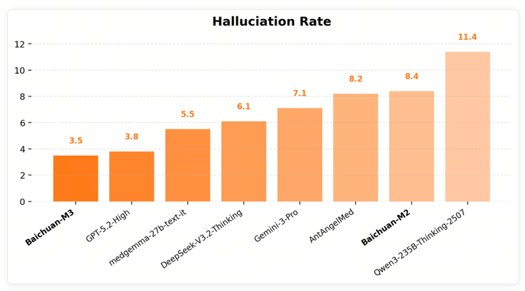 在这种无工具场景下的测试中,Baichuan-M3 的幻觉问题明显减少,整体可靠性已经超过 GPT-5.2。这意味着,模型在信息不充分时,不再急于给出结论,而是更倾向于收敛判断、降低风险。