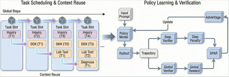 支撑这些结果的,是百川对医疗长决策链训练方式的系统调整。在训练中,复杂的诊疗流程被拆分成多个阶段分别优化,并通过分段流水线强化学习提高整体效率。同时,引入 SPAR 算法,对多轮对话中的每一步进行更精细的奖励和约束,减少无效提问和逻辑跳跃,让模型在保证准确率的同时,保持交互过程的连贯和可控。医学教育中的 OSCE 理念,也被引入到训练中,用来约束模型不仅对结果负责,也要对整个决策过程负责。