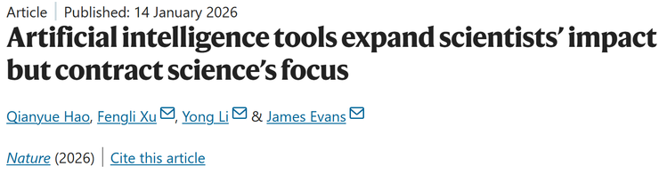 在这一问题背景下,清华大学 FIB 实验室牵头开展了一项大规模实证研究,论文题为《Artificial Intelligence Tools Expand Scientists’ Impact but Contract Science’s Focus》并已被 Nature 正刊收录。