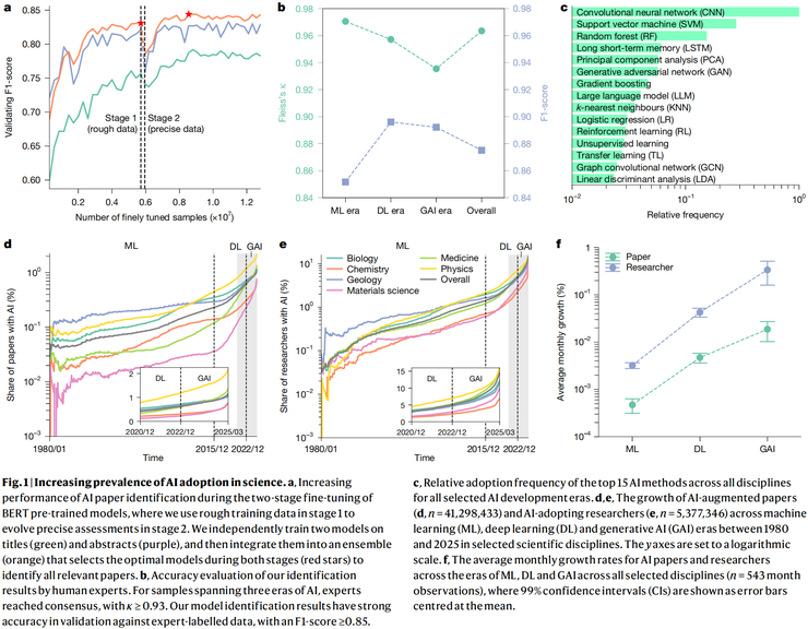 为验证这种识别方式的可靠性,研究人员组织具备相关背景的专家对随机抽样论文进行盲审标注,结果显示专家之间的一致性 Fleiss’ κ 达到 0.964,而模型在以专家标注为真值的评估中 F1 值达到 0.875。这一步为后续所有分析提供了关键前提,即 AI 与非 AI 研究成果的划分具有足够的准确性和稳定性。