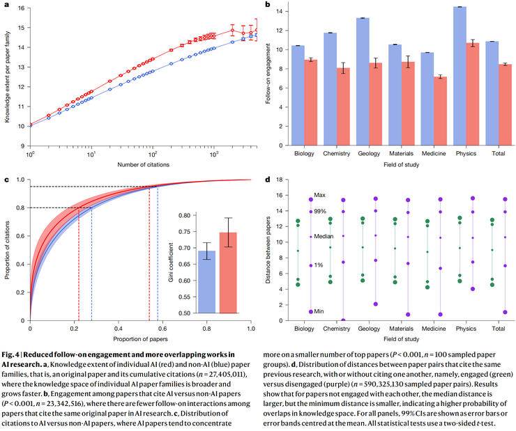 然而,效率的提升并不必然意味着科学探索的拓展。当 AI 更擅长处理数据充足、问题明确、路径成熟的研究任务时,科研活动是否会整体性地向这些方向集中,从而改变科学知识的分布结构和演化方式,这是一个长期存在但缺乏系统证据的问题。个体层面的成功是否真的能够累积为集体层面的进步,在 AI 深度介入科研之后,反而变得更加值得重新审视。