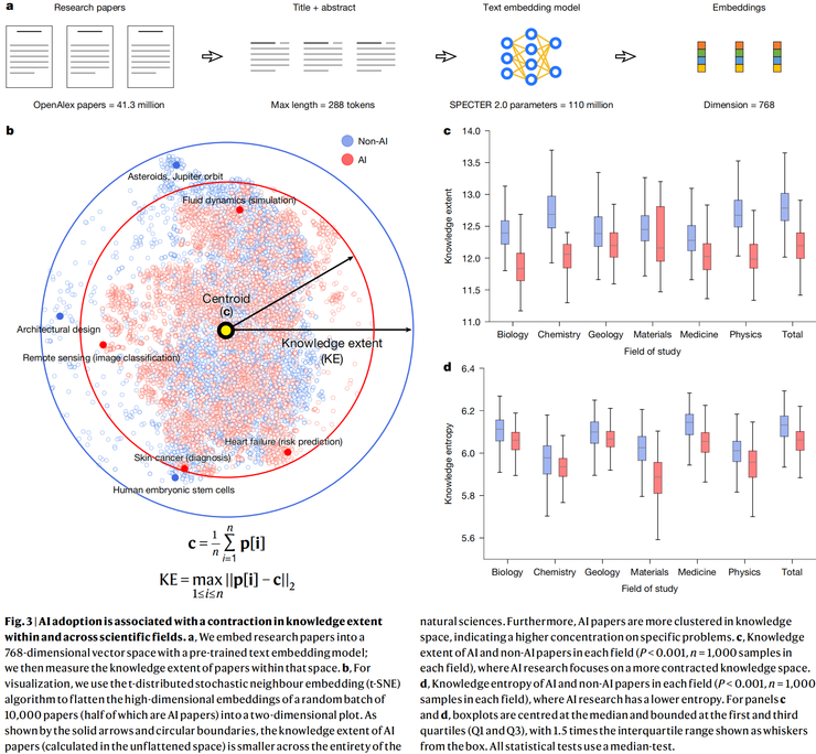 在集体层面的分析中,研究团队通过两类指标来量化科学结构的变化。第一类是知识广度,研究人员使用 SPECTER 2.0 将研究成果映射到 768 维语义空间中,并将一组抽样成果在该空间中所覆盖的最大距离定义为知识广度,用以比较 AI 与非 AI 研究在主题覆盖范围上的差异。