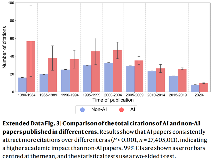 这些结论基于大规模样本分析得出。在包含 5,377,346 名研究者的数据中,六个自然科学学科里采用 AI 的研究者,其年均发表量均显著高于未采用者,且统计检验结果达到 P < 0.001。同时,在 27,405,011 篇引用记录完整的论文样本中,AI 论文在发表后的多年里,其年均引用数比非 AI 论文高出 98.70%。这些数据共同说明,AI 在个体层面显著放大了科学家的科研产出和学术影响力。