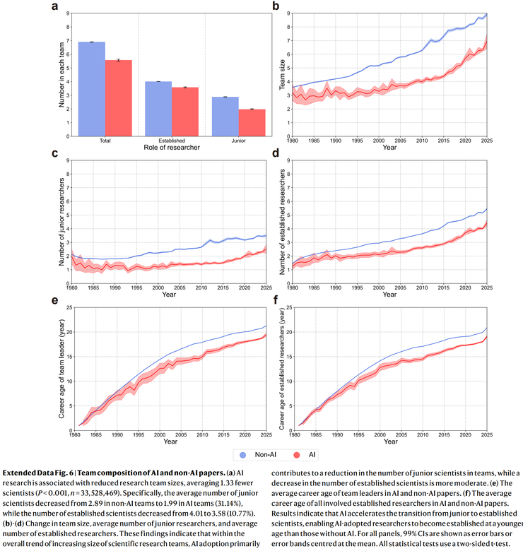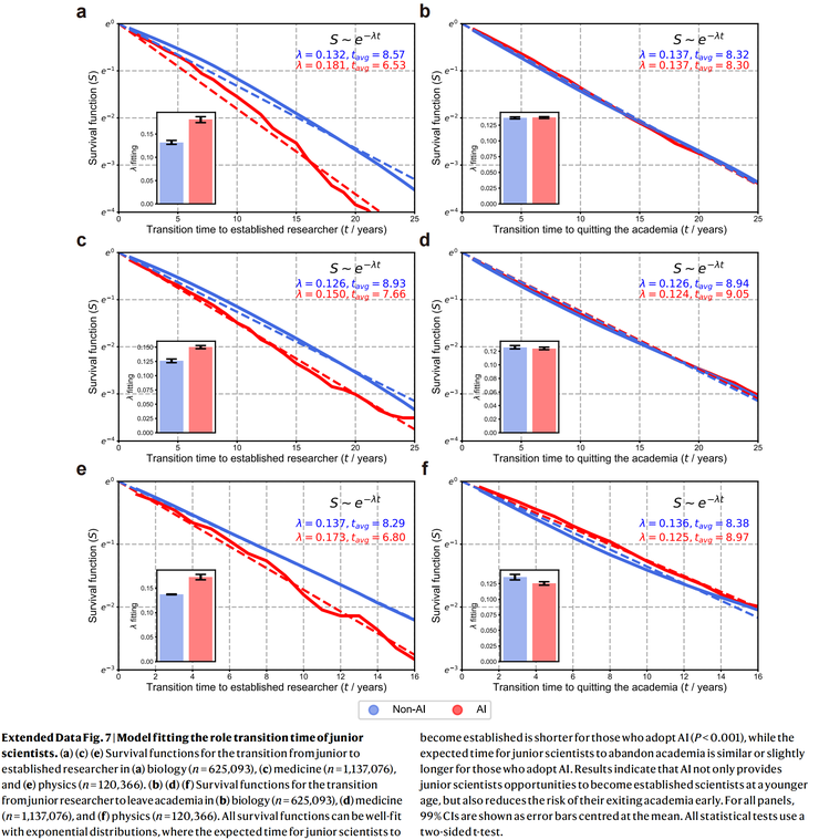在个人层面的分析中,研究团队主要使用研究人员的年度论文发表数量和年度引用数量来衡量科研产出与学术影响力,并结合职业阶段变化来刻画研究人员从 junior 阶段转变为 established 或 leader 的过程。基于这些指标,研究人员得出了使用 AI 的科学家发文数量增加 3.02 倍、引用数量增加 4.84 倍,并且更早成为研究负责人的结论,这些结果在不同学科中表现出一致的显著性。