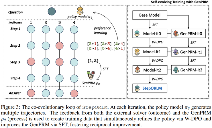 这项研究并未仅从模型规模或数据量入手,而是从训练范式本身出发,系统性反思了结果奖励与传统过程监督在运筹建模任务中的根本局限,并提出了一种由策略模型与生成式过程奖励模型(GenPRM)协同进化的自进化训练框架。通过将最终求解结果与对完整推理过程的回顾式、全局评估相结合,StepORLM 试图引导模型真正学习如何构建一致、可靠的运筹优化模型,而不仅仅是生成一个可行解。