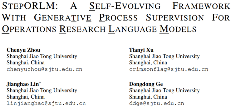 这种监督信号与任务本质之间的错位,使得建模错误可能被掩盖,甚至被反复强化,逐渐成为大模型走向工业级运筹优化应用的关键瓶颈。在这样的研究背景下,来自上海交通大学智能计算研究院葛冬冬、林江浩研究团队提出了《StepORLM: A Self-Evolving Framework with Generative Process Supervision for Operations Research Language Models》。