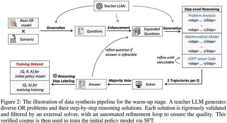 所有生成轨迹均需经过严格验证,包括代码执行以及外部 OR 求解器对可行性、最优性和执行正确性的检查。若验证失败,系统会自动将反馈返回给教师模型进行修正,直至通过验证或达到重试上限。最终,这个阶段构建了由问题及其对应的完整且正确推理轨迹组成的数据集,用于对策略模型进行监督微调。