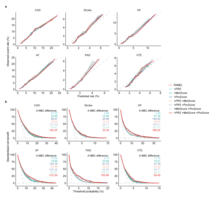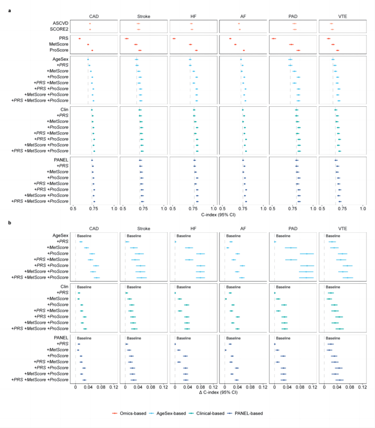 这项研究的核心发现是:在传统临床指标的基础上,引入血液多组学信息,可以显著提升对心血管疾病长期风险的预测能力,而且这种提升在多种心血管疾病中都表现得稳定一致。