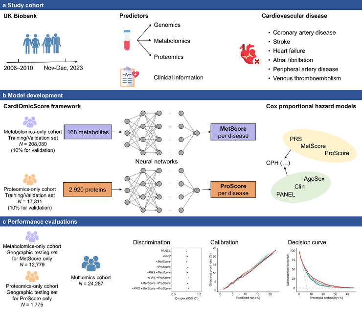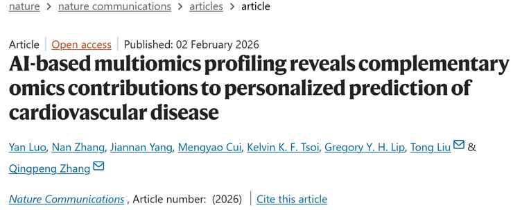 研究团队不再局限于“一病一模型”的思路,而是将蛋白组和代谢组信息纳入统一框架,同时评估多种心血管疾病的长期风险。相关成果以《AI-based multiomics profiling reveals complementary omics contributions to personalized prediction of cardiovascular disease 》为题发表于 Nature Communications,为心血管风险研究提供了一种更整体、也更贴近真实人群的研究路径。