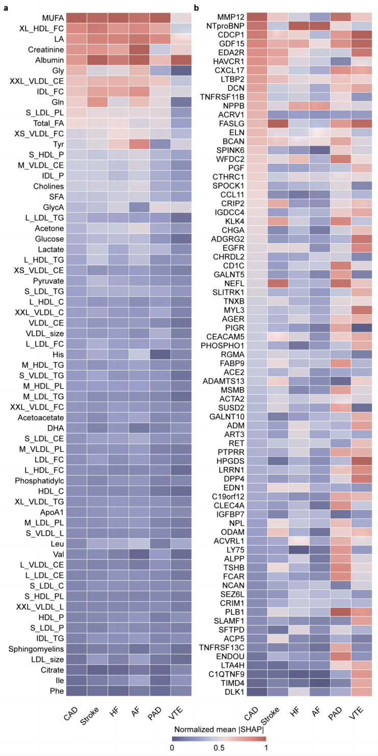 (图5. 心血管疾病风险预测中具有代表性的关键代谢物和蛋白质。a. 关键代谢物;b. 关键蛋白质。)