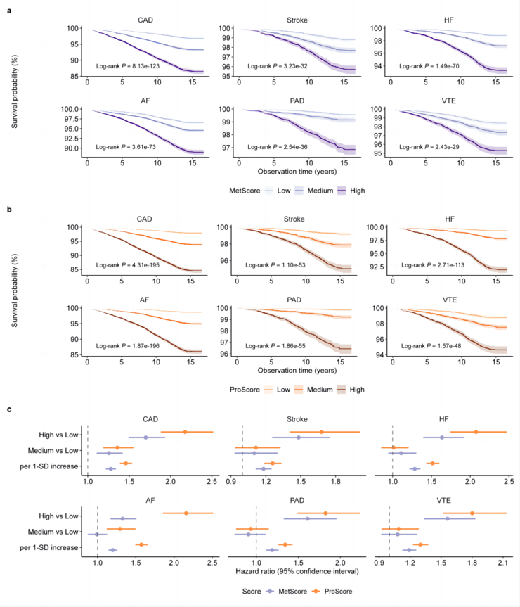 (图2. MetScore 与 ProScore 对心血管疾病风险的区分能力。a. 按MetScore分层的生存概率;b. 按ProScore分层的生存概率;c. MetScore和ProScore与心血管疾病风险的关联强度。)