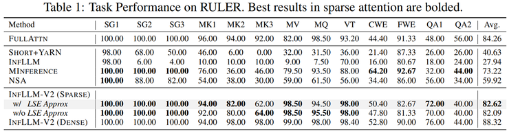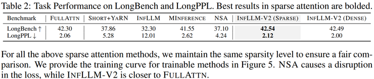正是这种“最小结构扰动”的切换方式,使 InfLLM-V2 能够在适配长上下文的同时,最大限度保留原有模型能力,这也构成了其与 NSA 等可训练稀疏注意力方法的本质差异。