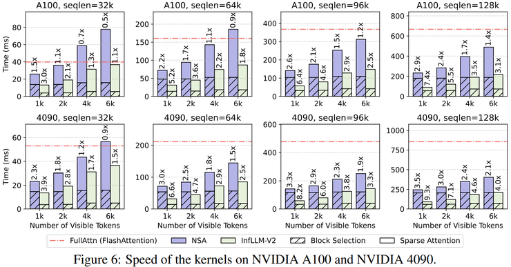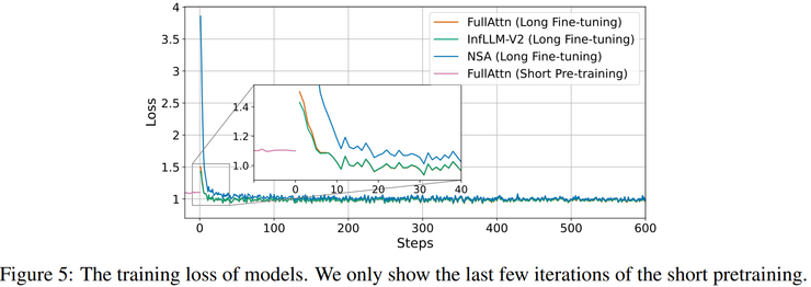 相关实验进一步验证了一个具有反直觉意味的结论:可训练的稀疏 attention 并不必然更适合短到长的迁移训练。研究人员的分析表明,NSA 在该设定下的性能问题并非源自稀疏机制本身,而是由于其引入了三套 Key–Value 投影、多路 attention 输出以及基于 gating 的结果聚合结构。