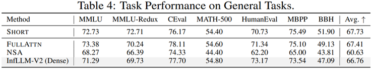 此外,研究人员还验证了一个在工程实践中尤为关键但常被忽视的问题:在完成长上下文微调之后,模型是否仍能够胜任常规短序列任务。在 MMLU、CEval、HumanEval 等评测中,InfLLM-V2 切回 dense 模式后依然保持了与 Full Attention 相当的性能,而 NSA 则出现了明显退化。这一结果从工程角度表明,InfLLM-V2 不会在适配长上下文能力的过程中破坏模型原有的通用能力。