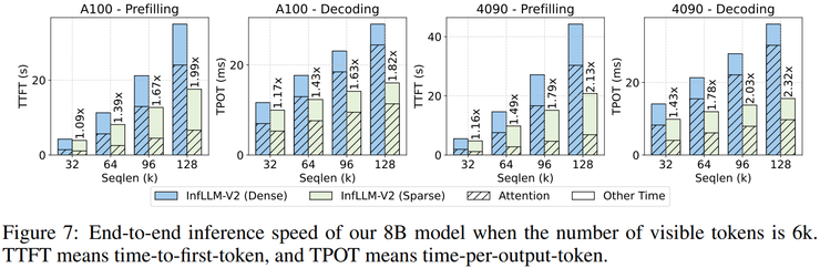 在可见 token 数为 6k(|I|=96)的设置下,InfLLM-V2 实现了约 2.1× 的 prefilling 加速和 2.3× 的 decoding 加速,而且这一结果是在前馈网络(FFN)部分完全未进行优化的前提下获得的,进一步说明该稀疏注意力设计在真实推理场景中具有切实可落地的加速价值。