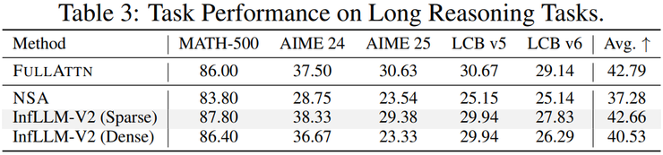 实验结果显示,InfLLM-V2(Sparse)在这些任务上的表现与 Full Attention 几乎持平,而 NSA 在所有相关任务中均出现了明显的性能下降。这直接表明,InfLLM-V2 所采用的稀疏注意力机制不会破坏链式思维推理过程中所需的“思维连续性”。