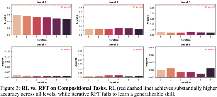 研究人员在对拥有了原子能力的SFT模型进行强化学习训练,通过改变强化学习阶段提供的题目难度(仅单函数、仅二层嵌套函数、单函数与二层嵌套函数混合),观察模型在三层、四层乃至更深层次的组合问题上的测试性能(这些问题在训练中从未出现过,且所涉及的原子函数本身也未在强化学习阶段见过),研究人员发现仅在单函数上进行强化学习的模型,在三层及以上组合任务上的准确率几乎为零,而一旦训练数据中包含最基础的二层嵌套函数,模型在三层组合上的准确率可提升至约 30%,在四层组合上仍保持约 15%,并在更高层级上持续显著优于随机水平。